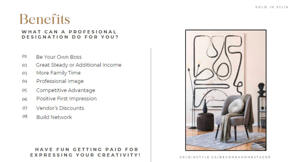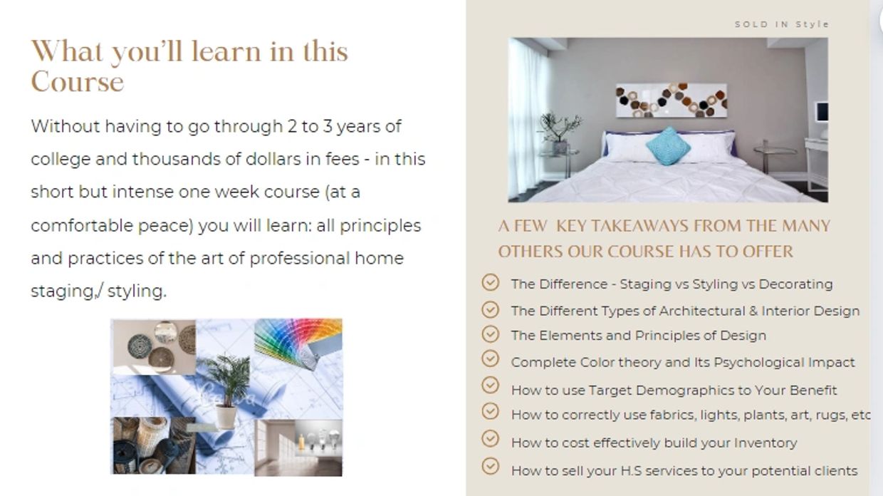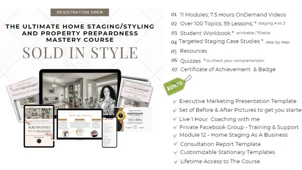 Learn the Art of Home Styling and become a main component in the process of home selling & enjoyable living - "SOLD IN Style" Home Staging Mastery Course is your key to unlocking a world of possibilities that offers great rewards! Earn your Home Staging Mastery Certificate in less than 1 week!