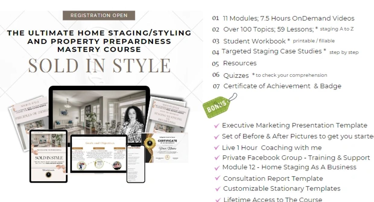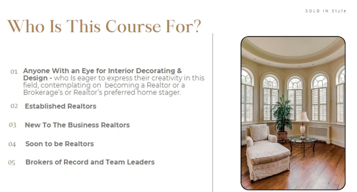 SOLD IN Style Home Staging Mastery Course it's strategically designed by realtors, for realtors, introducing a system proven by realtors to work 99.9% of the time.
